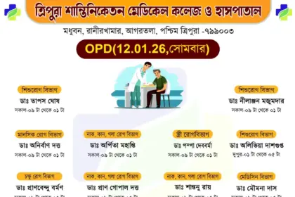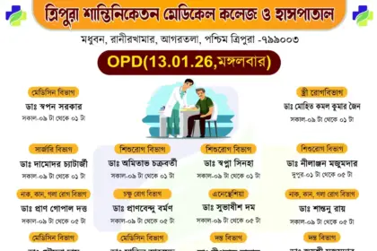 সাধারণ মানুষকে সুলভে সুচিকিৎসা পৌঁছে দিতে প্রতিশ্রুতিবদ্ধ ত্রিপুরা শান্তিনিকেতন মেডিকেল কলেজ ও হাসপাতাল। আগামীকাল অর্থাৎ সোমবার (১২/০১/২০২৬) ১০টাকার বহির্বিভাগে (OPD)…