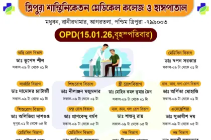 সাধারণ মানুষকে সুলভে সুচিকিৎসা পৌঁছে দিতে প্রতিশ্রুতিবদ্ধ ত্রিপুরা শান্তিনিকেতন মেডিকেল কলেজ ও হাসপাতাল। আগামীকাল অর্থাৎ বৃহস্পতিবার(১৫/০১/২০২৬) ১০টাকার বহির্বিভাগে (OPD) যে…
