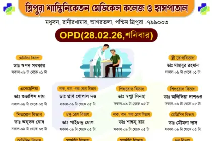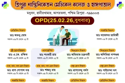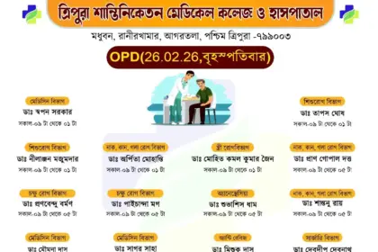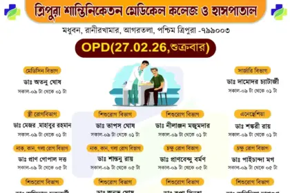 সাধারণ মানুষকে সুলভে সুচিকিৎসা পৌঁছে দিতে প্রতিশ্রুতিবদ্ধ ত্রিপুরা শান্তিনিকেতন মেডিকেল কলেজ ও হাসপাতাল। আগামীকাল অর্থাৎ বৃহস্পতিবার (২৬/০২/২০২৬) ১০টাকার বহির্বিভাগে (OPD)…